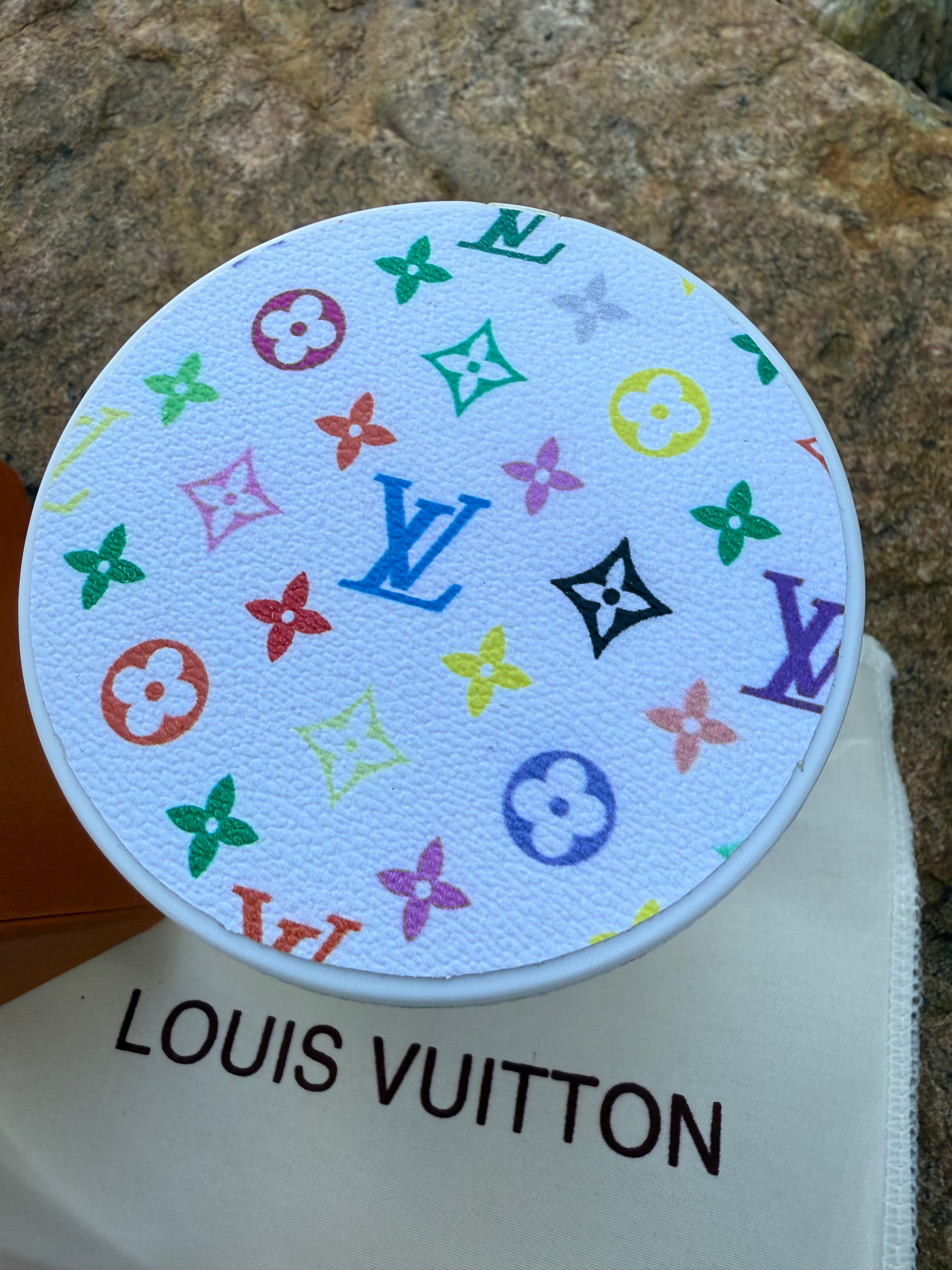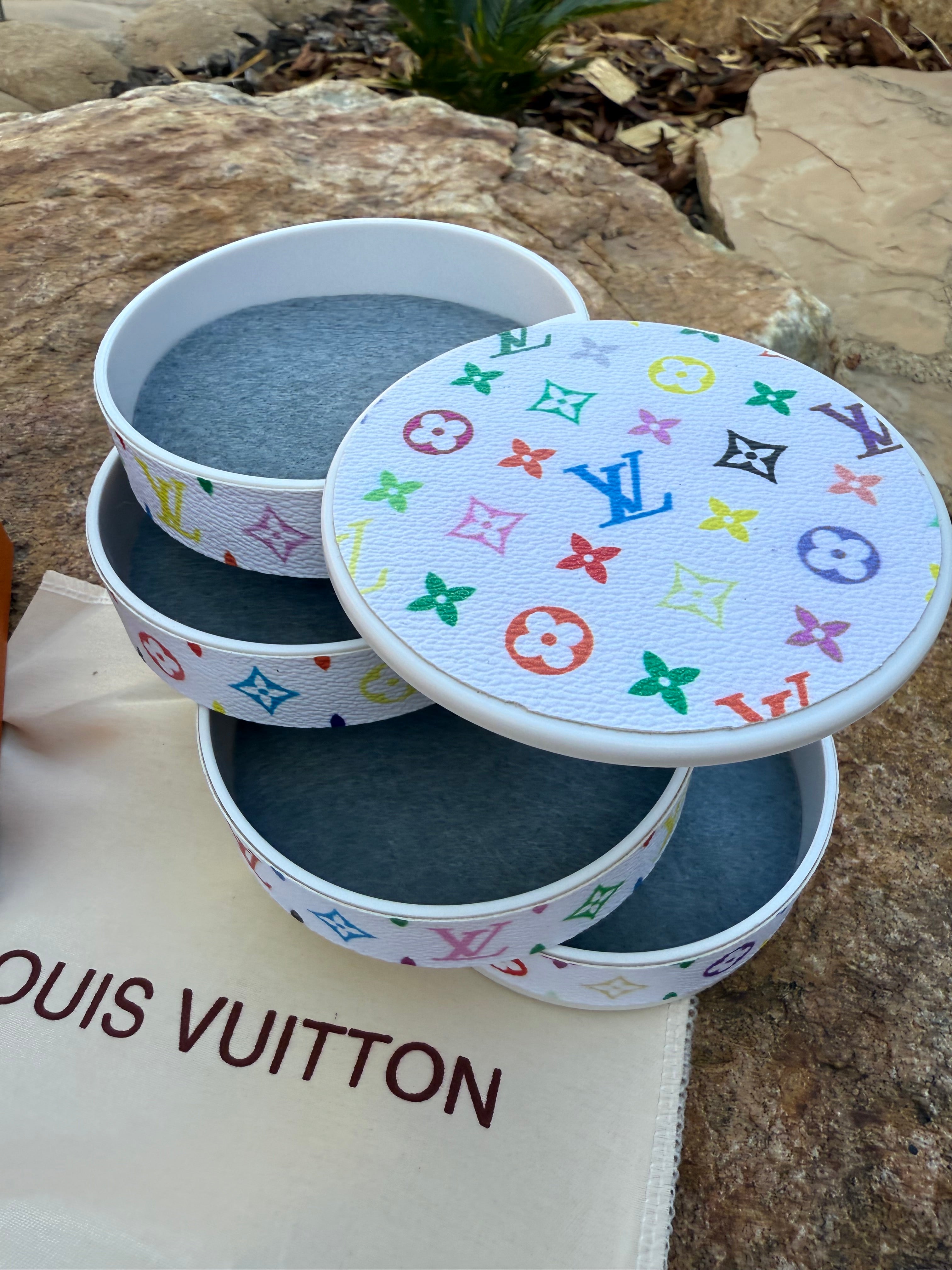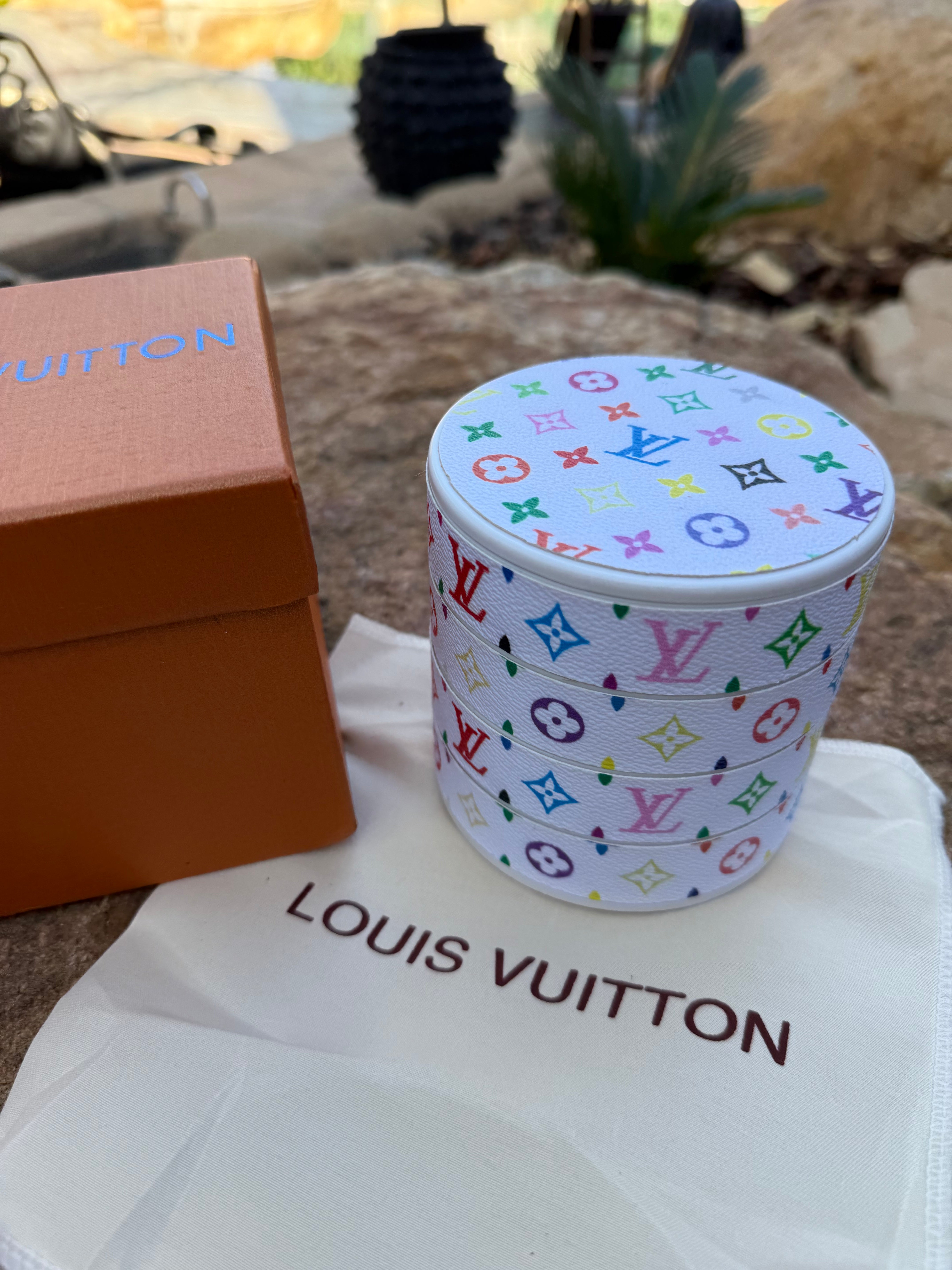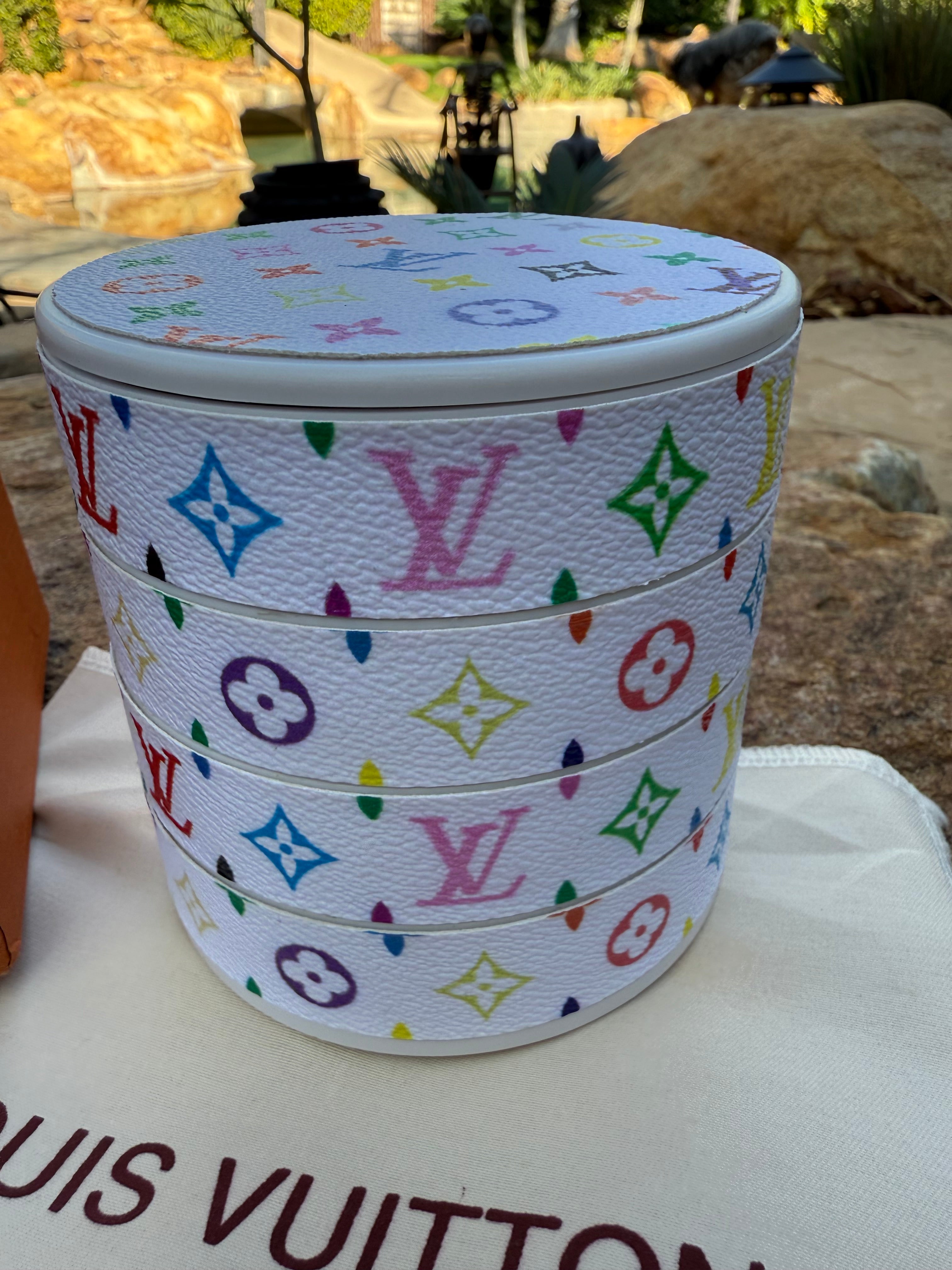 A rare find in white Murakami ! Such a stunning Louis Vuitton piece to have on your counter or display . It is a four tier hard plastic tray can be used for your rings or as an organizer. Top lid flips up to reveal a mirror and clicks back down. Inside trays are felted for no scratch comfort . What a staple piece to have ! it is brand new will come with the box shown and the receipt if you wish just ask prior to shipping this was a promo exclusive VIP gift from LV boutique abroad.This cannot be purchased at the store as it was a client gift . Rare piece !!